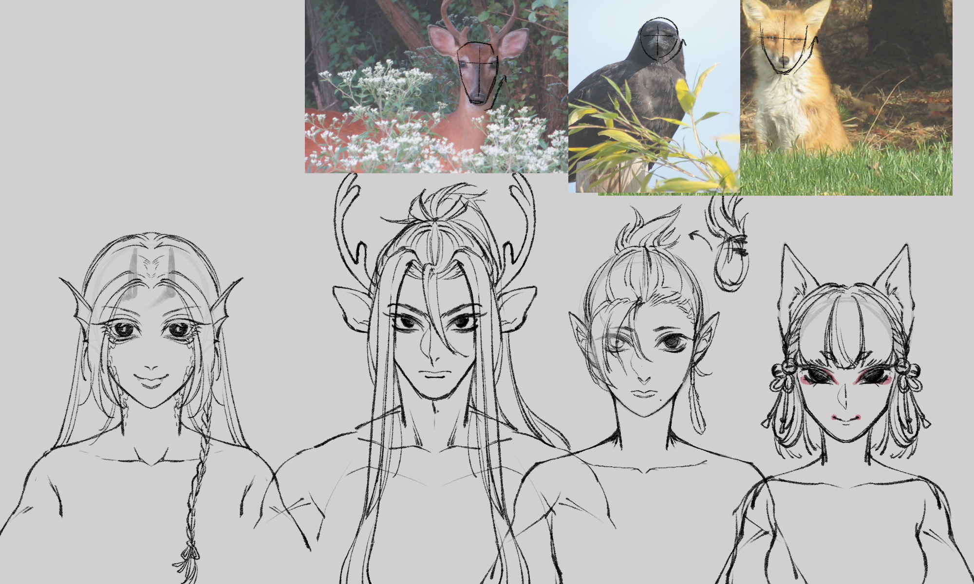 Inside the doc, Azure mentioned the possibility of giving the characters animalistic features. Except for MC, who is more leaning into a dragon/ water dragon thing. And obviously, I had to give them (cute) animal features XD Yamato is based on a deer, Shiori on a fox / kitsune and Hikaru is a crow / karasu tengu. These were based on the notes I was given and as you can see, I looked up front facing images of these animals, taking their “face” shapes to have them reflected in the characters as well, along with their eye shapes being unique. A big part of the process was making the characters truly unique and easily distinguishable.