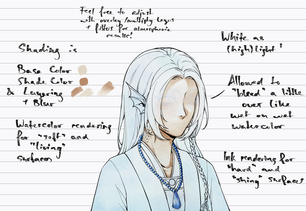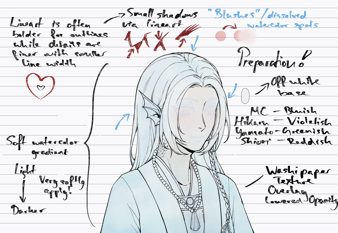 To help Polly match that style, I also provided a (rough) guide to follow and also a guideline for myself to keep the steps cohesive and well, because I’m forgetful like that, lol. I’m a Clip Studio Paint user, so I had a lot of resources at hand that helped me imitate a watercolor style thanks to user uploaded materials on the asset store! If you were curious which brushes and textures I used, you can check them out yourself:
