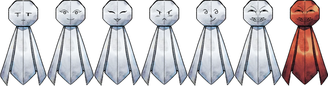 As you can see, they have different faces! I based them on the characters actually (+ just regular Japanese ‘face’ one). You can probably figure out which one represents who and the red one remained unused, but was just funny to include lol. If you remember that scene, well, wasn’t it ominous seeing these paper dolls ‘hanging’ from the trees while looking like all the characters? :)