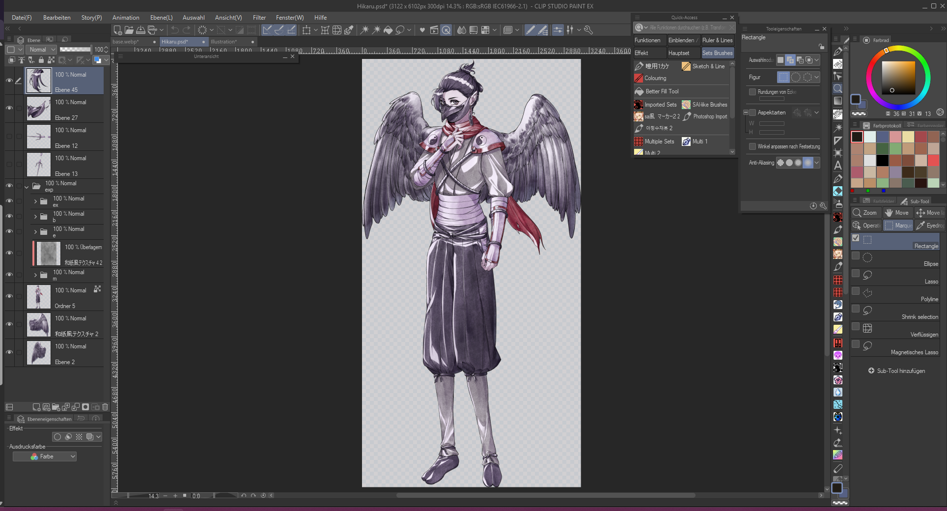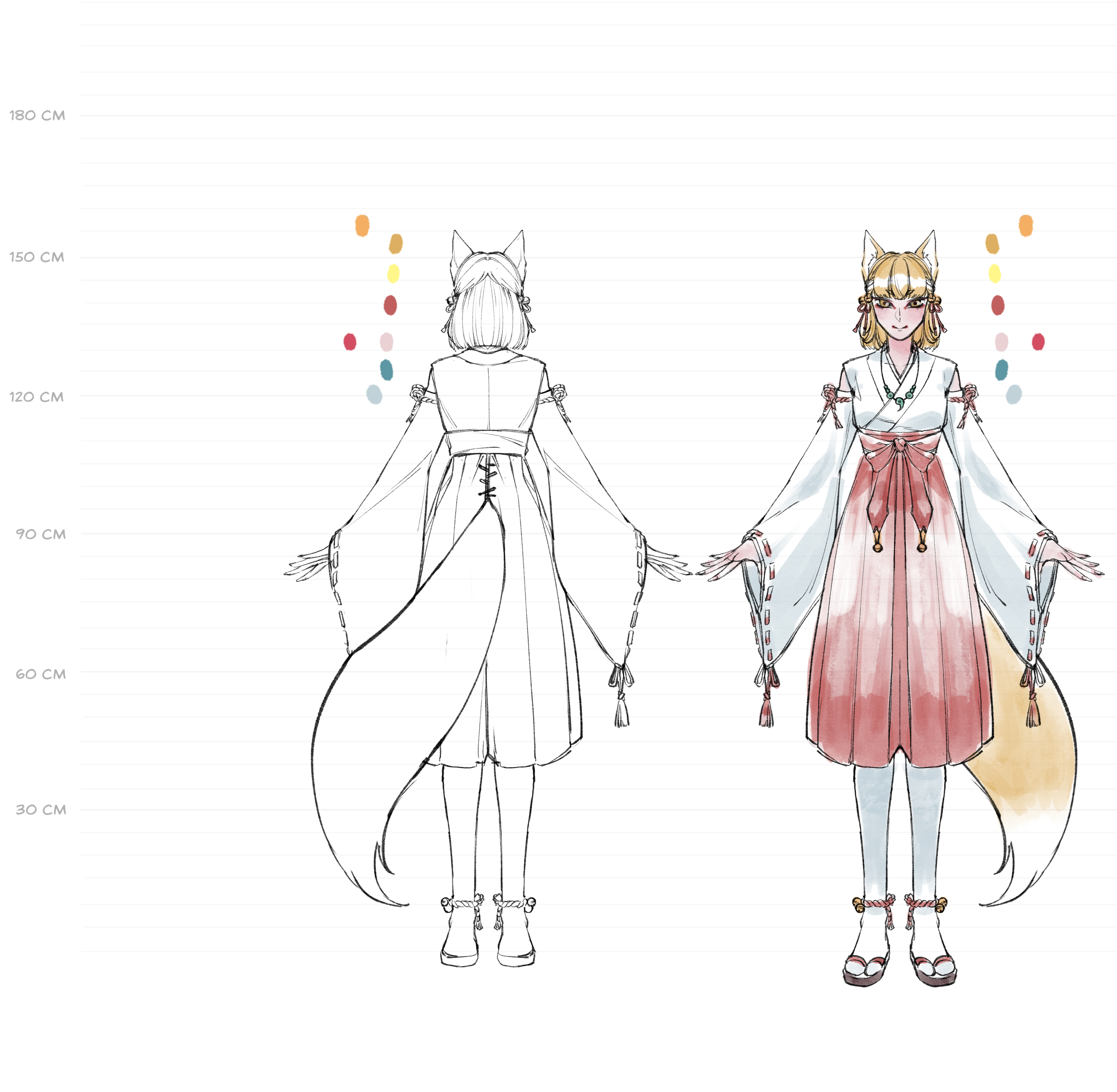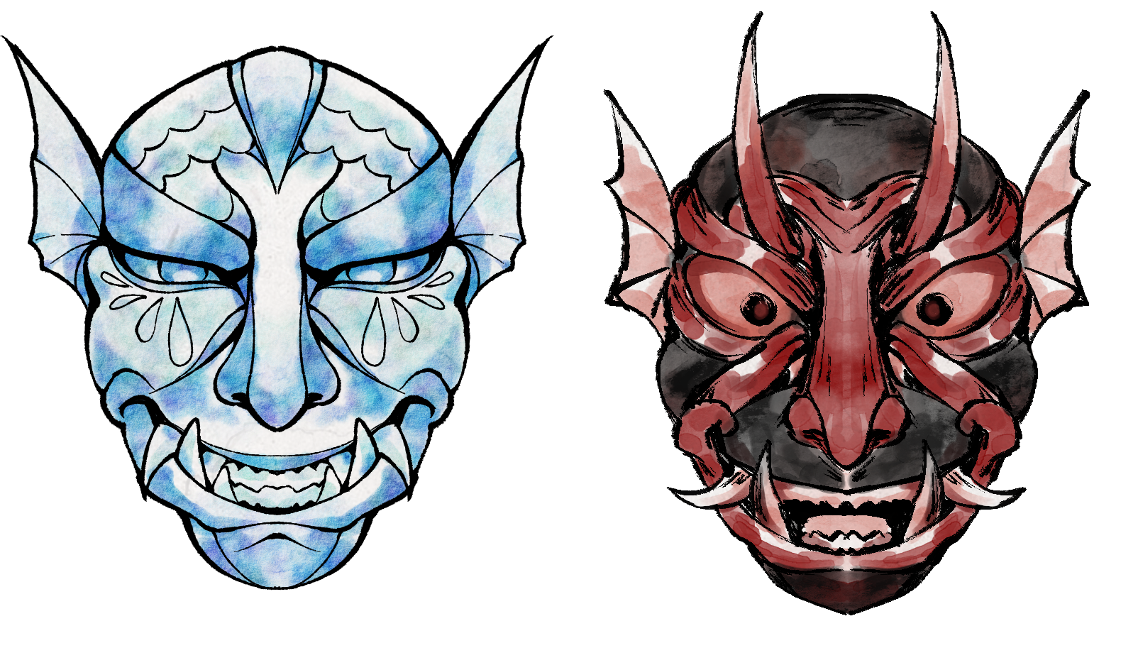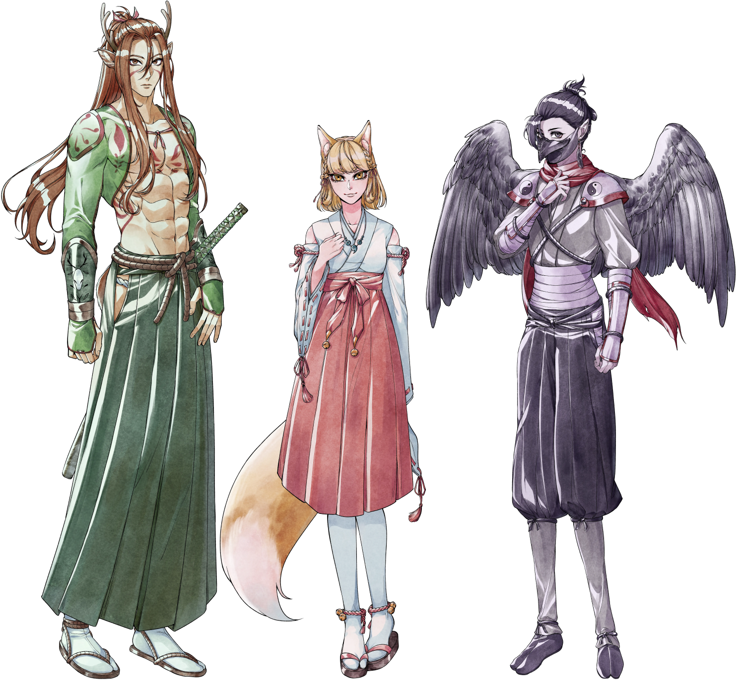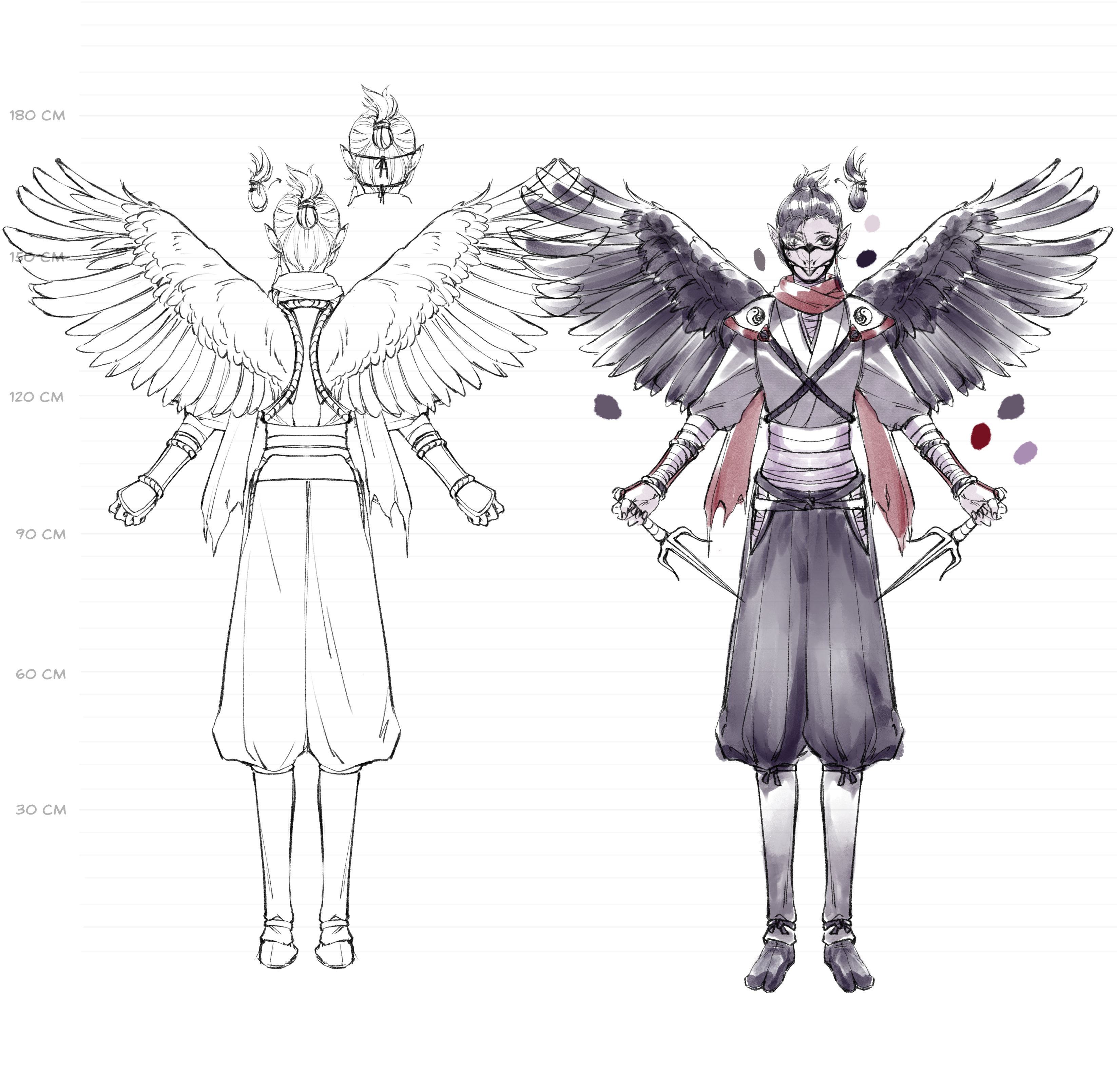 Given they were intended with crow features, a karasu tengu as a base idea was concepted for them and I gave them a mask to emphasize that. Probably by now people wonder why they have a white eye and scar… To be honest, that’s up for interpretation. My main thought was to draw attention to Hikaru’s face even when they wear a mask and to avoid that people focus on the scarf too much. Explanation for the eye can be that after their father disappeared, someone hurt Hikaru and MC protected them (maybe that person then got eaten by Yamakui lol) or Yamato messed up during training once and accidentally cut Hikaru (and probably cried about it in secret heh).