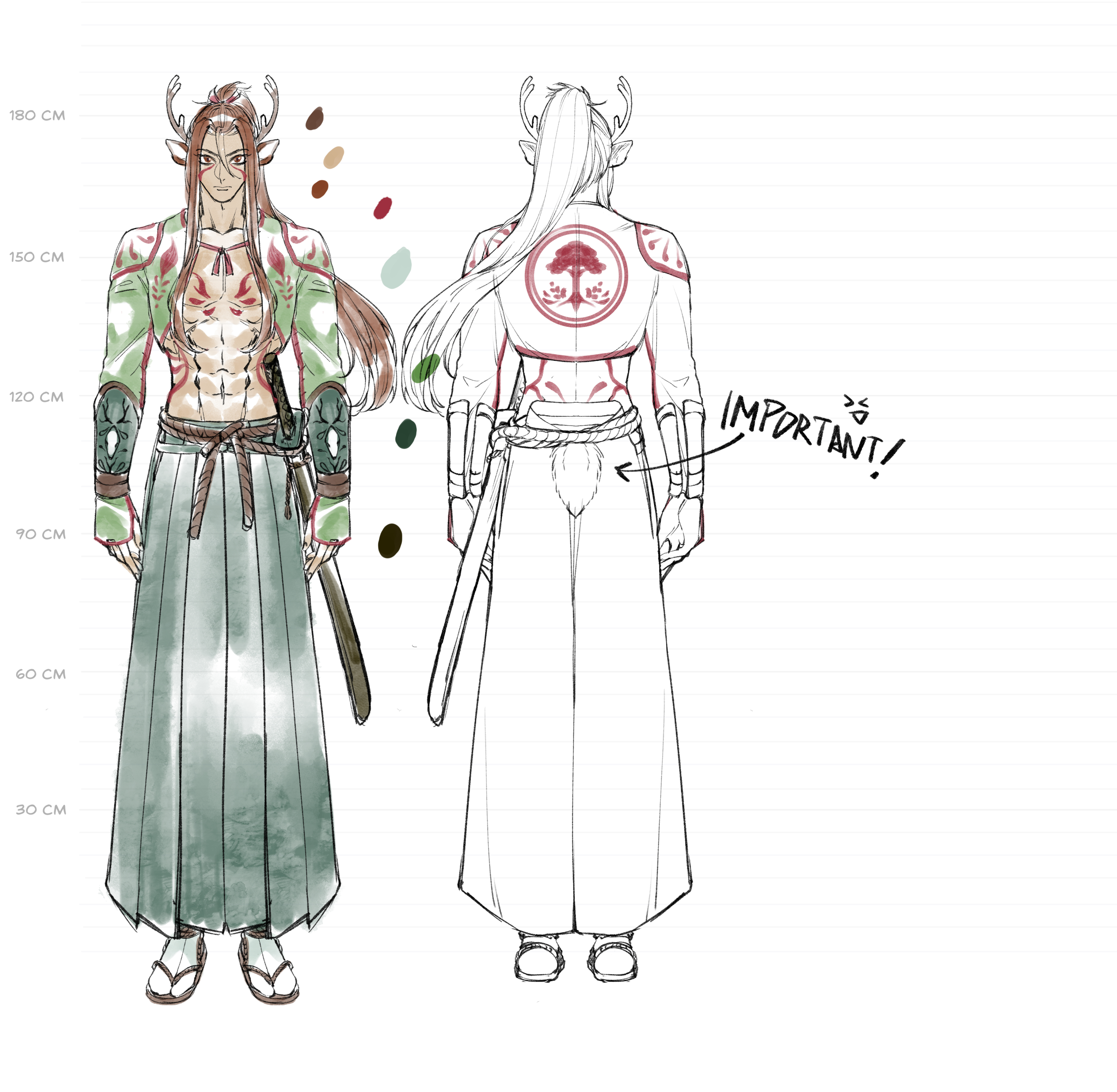 And yes, his deer tail is VERY important. I repeat, VERY IMPORTANT. I even adjusted his sprite pose to be able to show his behind a bit more and his cute lil tail twitching there. But on a more serious note, unlike the other characters, I couldn’t really tie him in with any mythical creature, even if deers in Japan can be seen as sacred creatures. So what got a big mythical deer? Mononokehime. In fact, his top was inspired by the one the male protagonist wears in the movie, and markings lean towards the markings you see on the forest god’s true form. His color palette is for that reason brown and green, his skin being lightly tanned from training in the sun. While he is an aspiring samurai of sorts, I depicted him more as a ronin here, since he gave me the vibe of someone who protects his loved ones, but not necessarily a lord… lol.